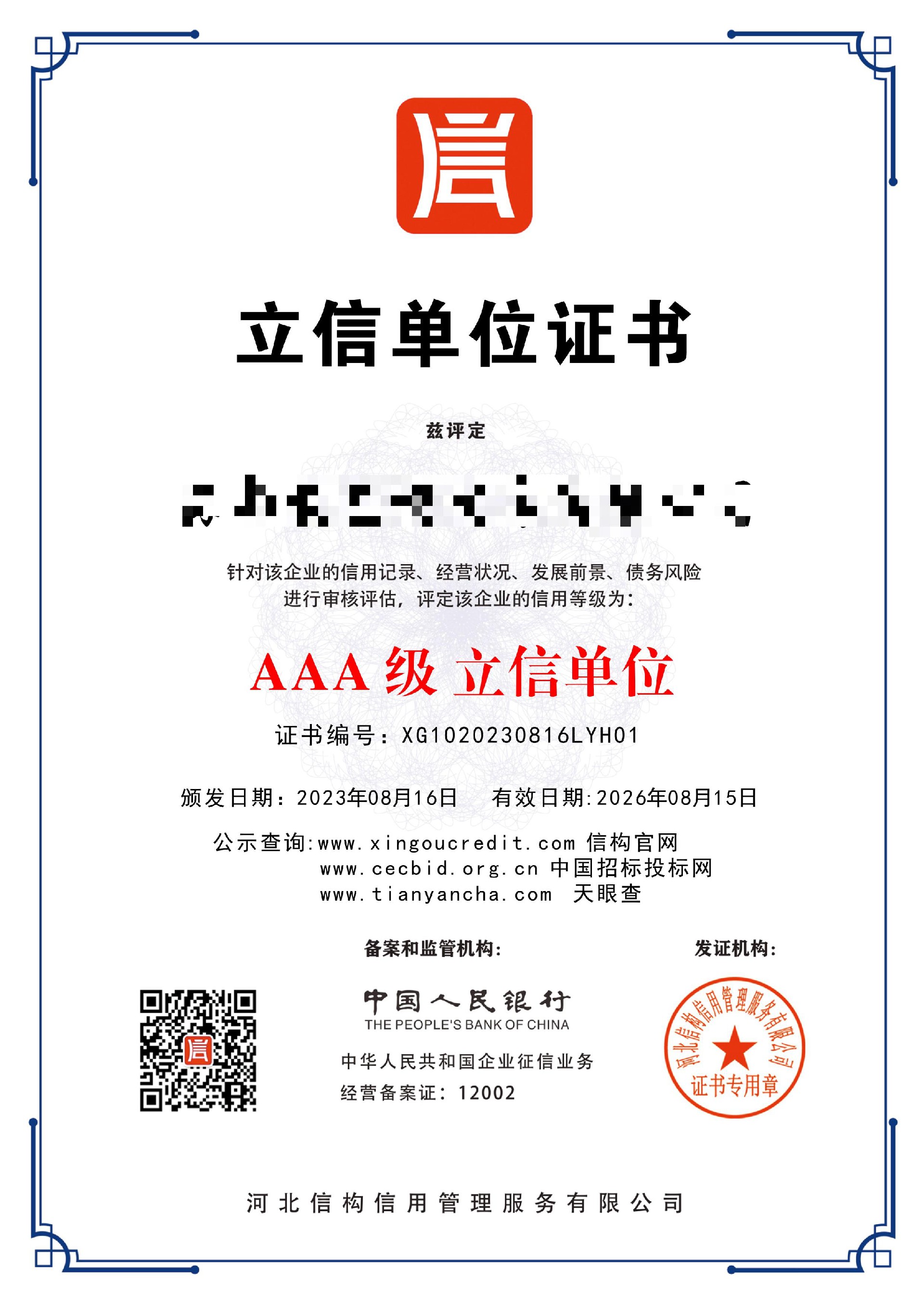 3A認證人民銀行備案的AAA級立信單位認證證書有效期三年。